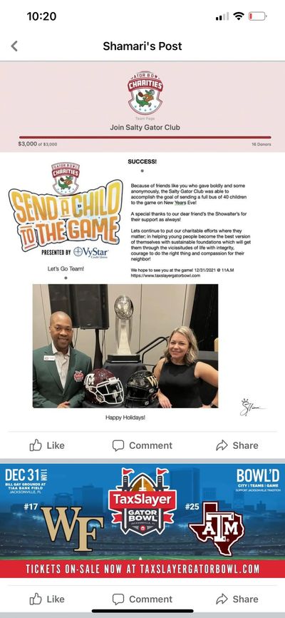 Each year, thousands of children from across the First Coast are afforded the opportunity to attend the bowl game thanks to contributions from companies and individuals throughout our community. For many children, this once-in-a-lifetime experience helps to create memories and build friendships that live on far past the final whistle!